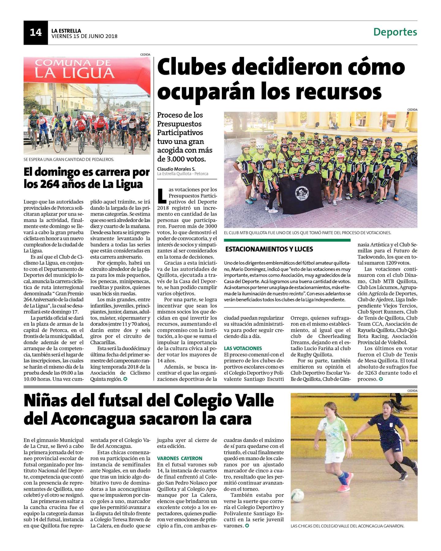 Las votaciones continuaron con el club Dínamo, Club MTB Quillota, Club Los Lúcumos, Agrupación Agrícola de Deportes, Club de Ajedrez, Liga Independiente Viejos Tercios, Club Sport Runners, Club de Tenis de Quillota, Club Team CCA, Asociación de Rayuela Quillota, Club Quillota Racing, Asociación Provincial de Voleibol.