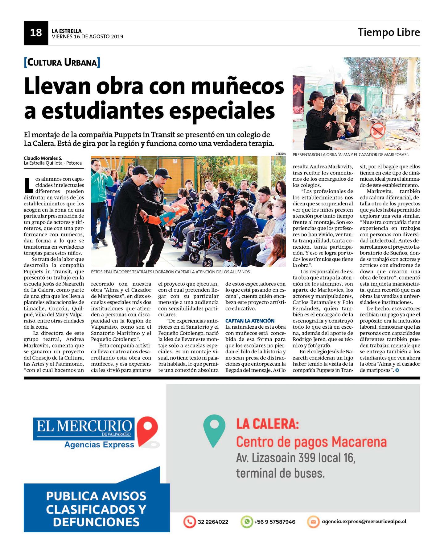 Se trata de la labor que desarrolla la compañía Puppets in Transit, que presentó su trabajo en la escuela Jesús de Nazareth de La Calera, como parte de una gira que los lleva a planteles educacionales de Limache, Concón, Quilpué, Viña del Mar y Valparaíso, entre otras ciudades de la zona.