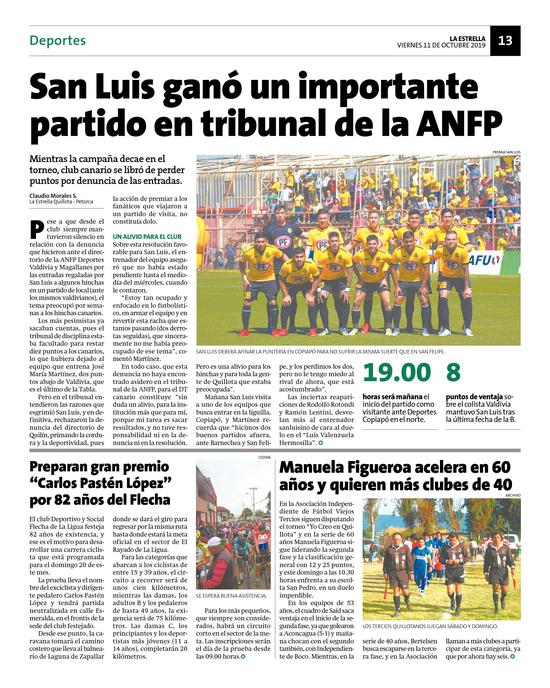 6San Luis ganó un importante partido en tribunal de la ANFP Pág. 13