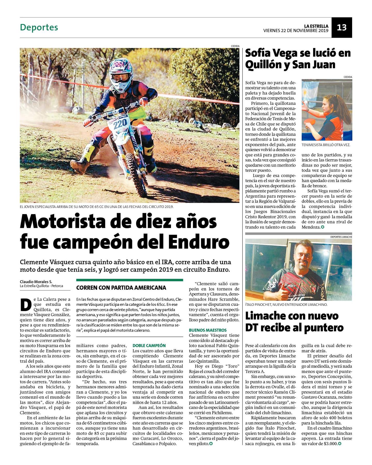 Los cuatro años que lleva compitiendo Clemente Vásquez en las carreras del Enduro Infantil, Zonal Norte, le han permitido obtener cada vez mejores resultados, pese a que esta temporada ha dado cierta ventaja al competir en una serie en donde corren niños de hasta 12 años.