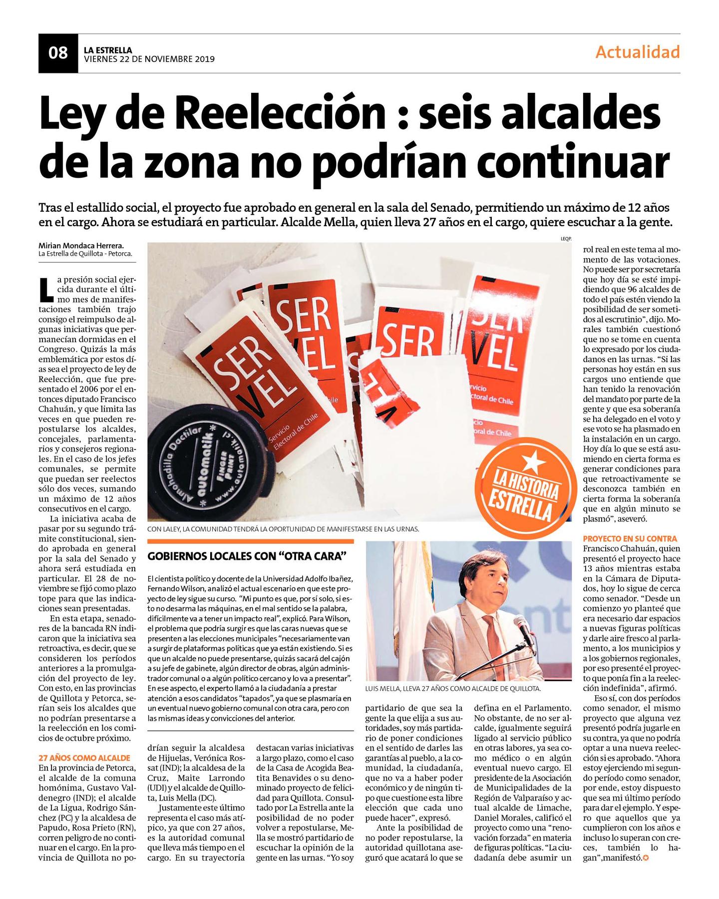 Justamente este último representa el caso más atípico, ya que con 27 años, es la autoridad comunal que lleva más tiempo en el cargo. En su trayectoria destacan varias iniciativas a largo plazo, como el caso de la Casa de Acogida Beatita Benavides o su denominado proyecto de felicidad para Quillota. Consultado por La Estrella ante la posibilidad de no poder volver a repostularse, Mella se mostró partidario de escuchar la opinión de la gente en las urnas. "Yo soy partidario de que sea la gente la que elija a sus autoridades, soy más partidario de poner condiciones en el sentido de darles las garantías al pueblo, a la comunidad, la ciudadanía, que no va a haber poder económico y de ningún tipo que cuestione esta libre elección que cada uno puede hacer", expresó.