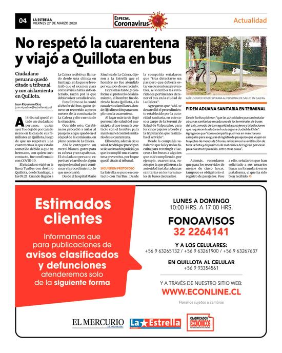 19No respetó la cuarentena y viajó a Quillota en bus Pág. 4