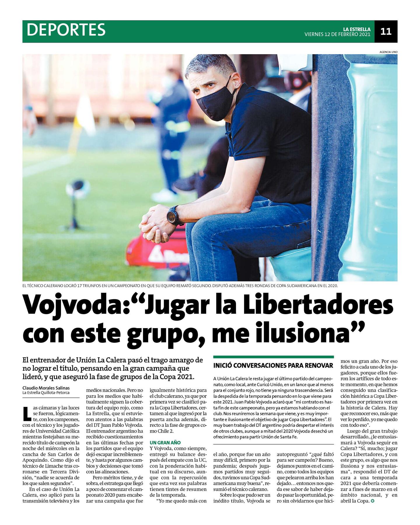 A Unión La Calera le resta jugar el último partido del campeonato, como local, ante Curicó Unido, en un lance que al menos para el conjunto rojo, no tiene ya ninguna trascendencia. Será la despedida de la temporada pensando en lo que viene para este 2021. Juan Pablo Vojvoda aclaró que "mi contrato es hasta fin de este campeonato, pero ya estamos hablando con el club. Nos reuniremos la semana que viene, y es muy importante e ilusionante el objetivo de jugar Copa Libertadores". El muy buen trabajo del DT argentino podría despertar el interés de otros clubes, aunque a mitad del 2020 Vojvoda desechó un ofrecimiento para partir Unión de Santa Fe.
