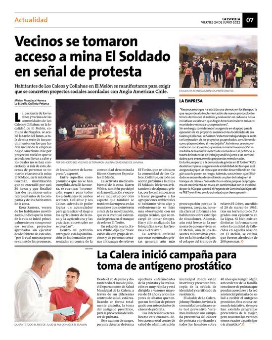 34Vecinos se tomaron acceso a mina El Soldado en señal de protesta Pág. 7