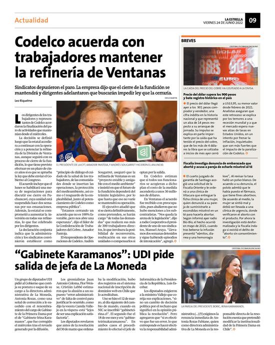 36Codelco acuerda con trabajadores mantener la refinería de Ventanas Pág. 9