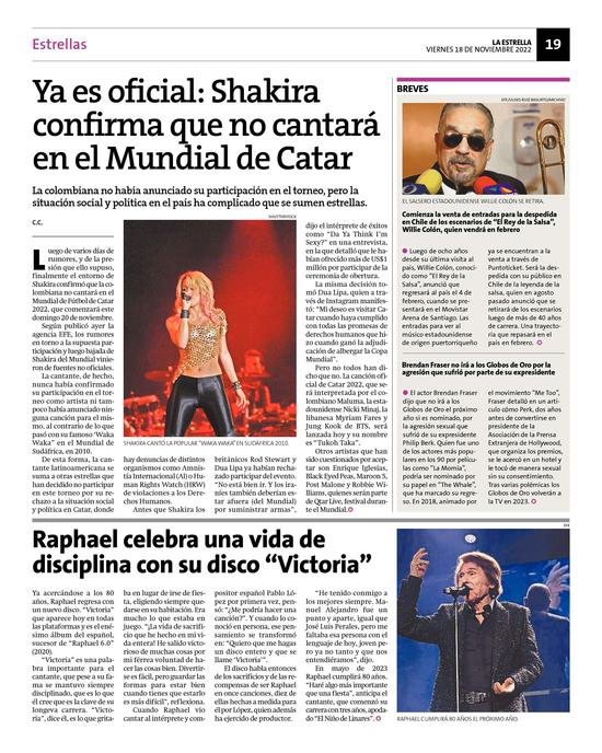 44Ya es oficial: Shakira confirma que no cantará en el Mundial de Catar Pág. 19