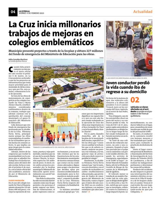 23La Cruz inicia millonarios trabajos de mejoras en colegios emblemáticos Pág. 4