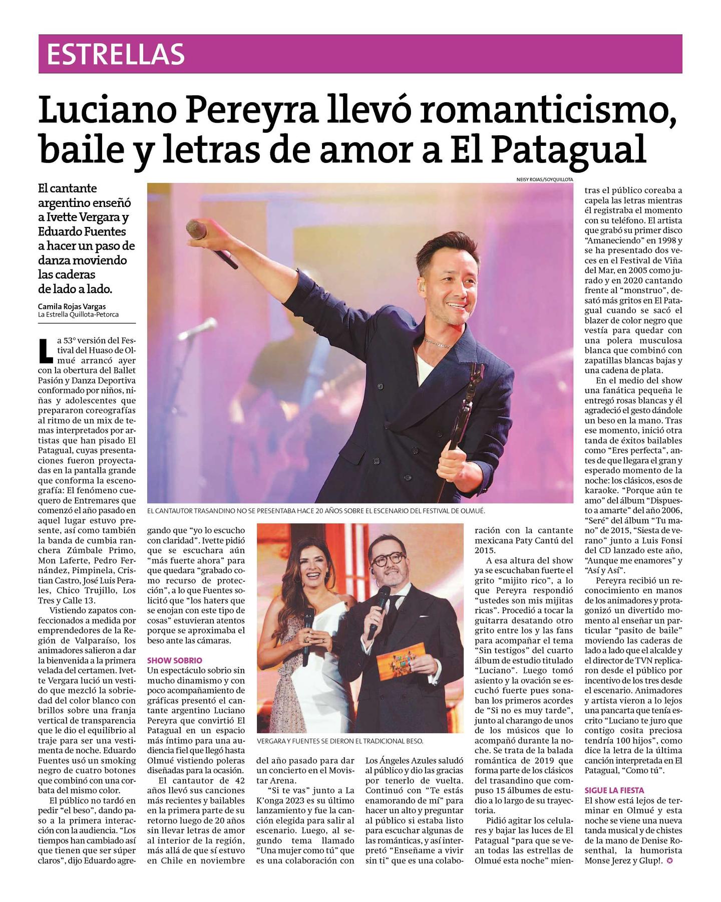 Un espectáculo sobrio sin mucho dinamismo y con poco acompañamiento de gráficas presentó el cantante argentino Luciano Pereyra que convirtió El Patagual en un espacio más íntimo para una audiencia fiel que llegó hasta Olmué vistiendo poleras diseñadas para la ocasión. El cantautor de 42 años presentó sus canciónes más recientes y bailables en la primera parte de su retorno luego de 20 años sin llevar letras de amor al interior de la región, sin embargo sí estuvo en Chile en noviembre del año pasado para dar un concierto en el Movistar Arena.