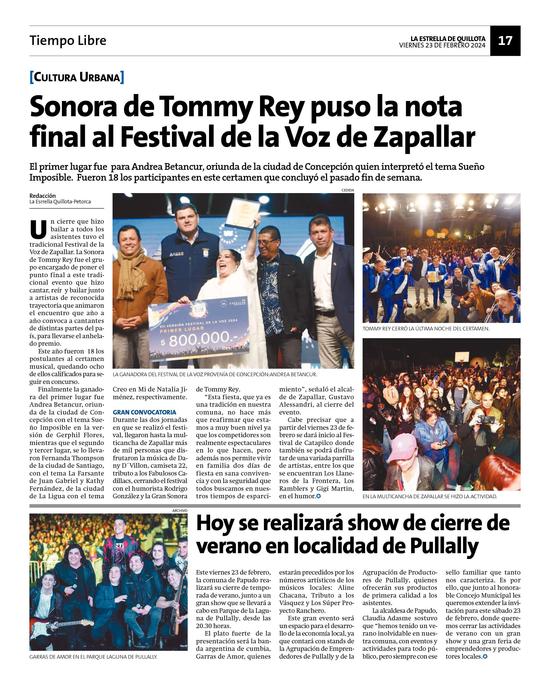 16Sonora de Tommy Rey puso la nota final al Festival de la Voz de Zapallar Pág. 17
