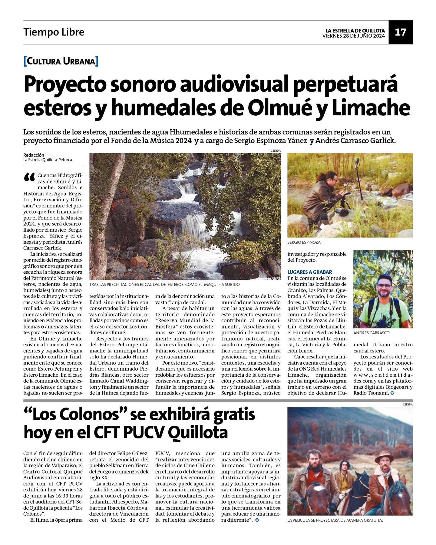 "Cuencas Hidrográficas de Olmué y Limache. Sonidos e Historias del Agua. Registro, Preservación y Difusión" es el nombre del proyecto que fue financiado por el Fondo de la Música 2024. y que será desarrollado por el músico Sergio Espinoza Yáñez y el cineasta y periodista Andrés Carrasco Garlick,