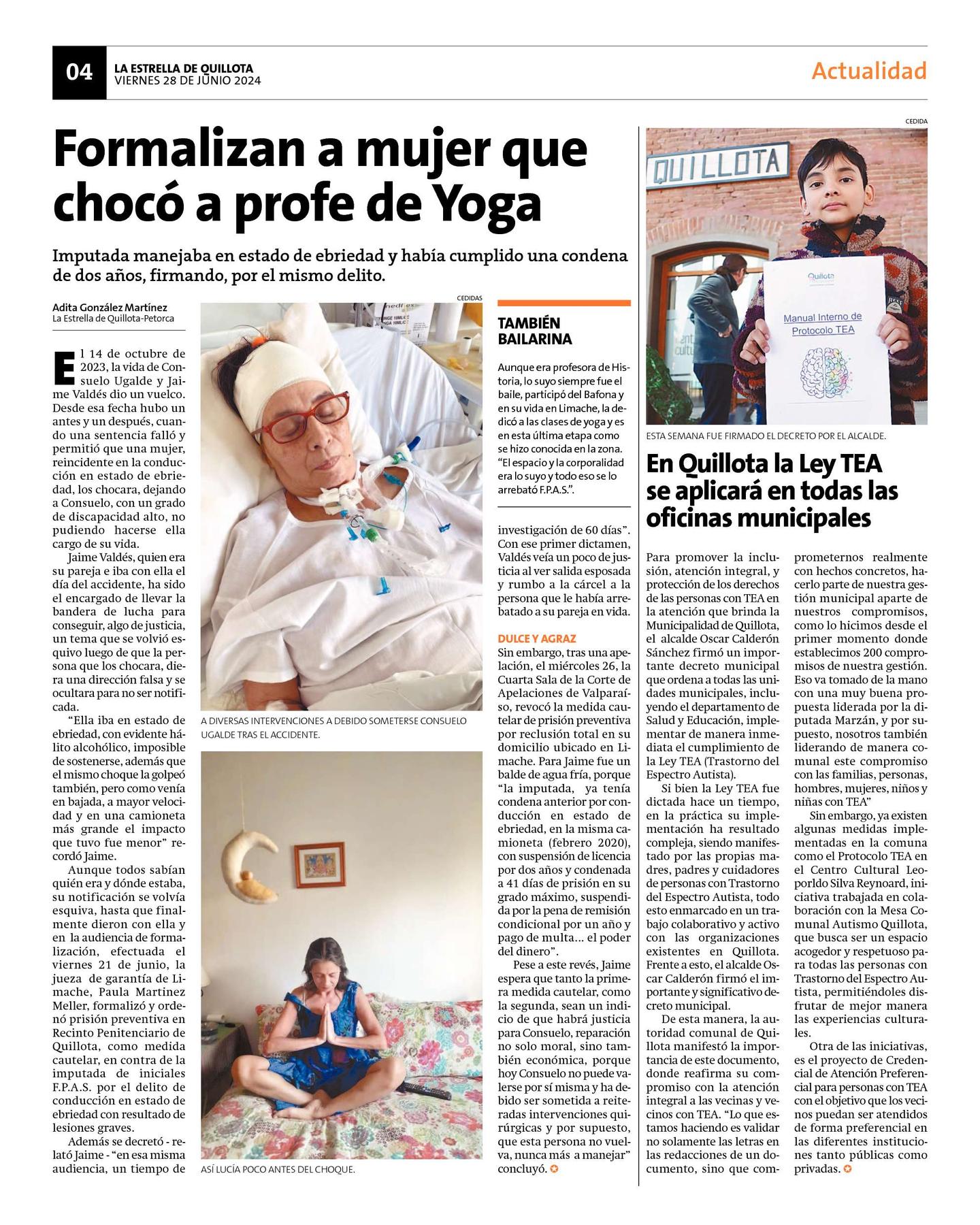 Pese a este revés, Jaime espera que tanto la primera medida cautelar, como la segunda, sean un indicio de que habrá justicia para Consuelo, reparación no solo moral, sino también económica, porque hoy Consuelo no puede valerse por sí misma y ha debido ser sometida a reiteradas intervenciones quirúrgicas y por supuesto, que esta persona no vuelva, nunca más a manejar" concluyó. J