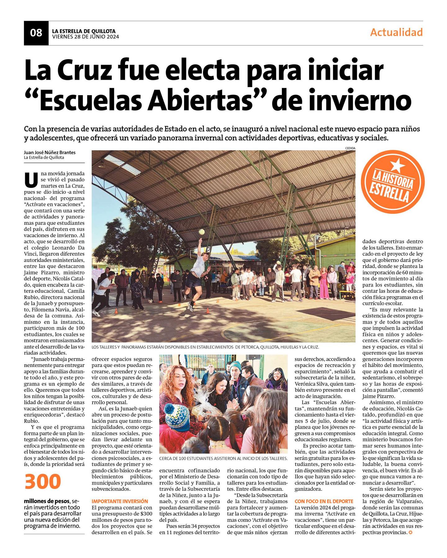 Una movida jornada se vivió el pasado martes en La Cruz, pues se dio inicio -a nivel nacional- del programa "Actívate en vacaciones", que contará con una serie de actividades y panoramas para que estudiantes del país, disfruten en sus vacaciones de invierno. Al acto, que se desarrolló en el colegio Leonardo Da Vinci, llegaron diferentes autoridades ministeriales, entre las que destacaron Jaime Pizarro, ministro del deporte, Nicolás Cataldo, quien encabeza la cartera educacional, Camila Rubio, directora nacional de la Junaeb y porsupuesto, Filomena Navia, alcaldesa de la comuna. Asimismo en la instancia, participaron más de 100 estudiantes, los cuales se mostraron entusiasmados ante el desarrollo de las variadas actividades.