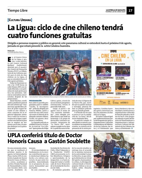 11La Ligua: ciclo de cine chileno tendrá cuatro funciones gratuitas Pág. 17