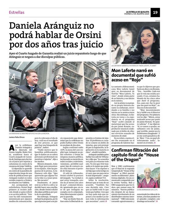 19Daniela Aránguiz no podrá hablar de Orsini por dos años tras juicio Pág. 19